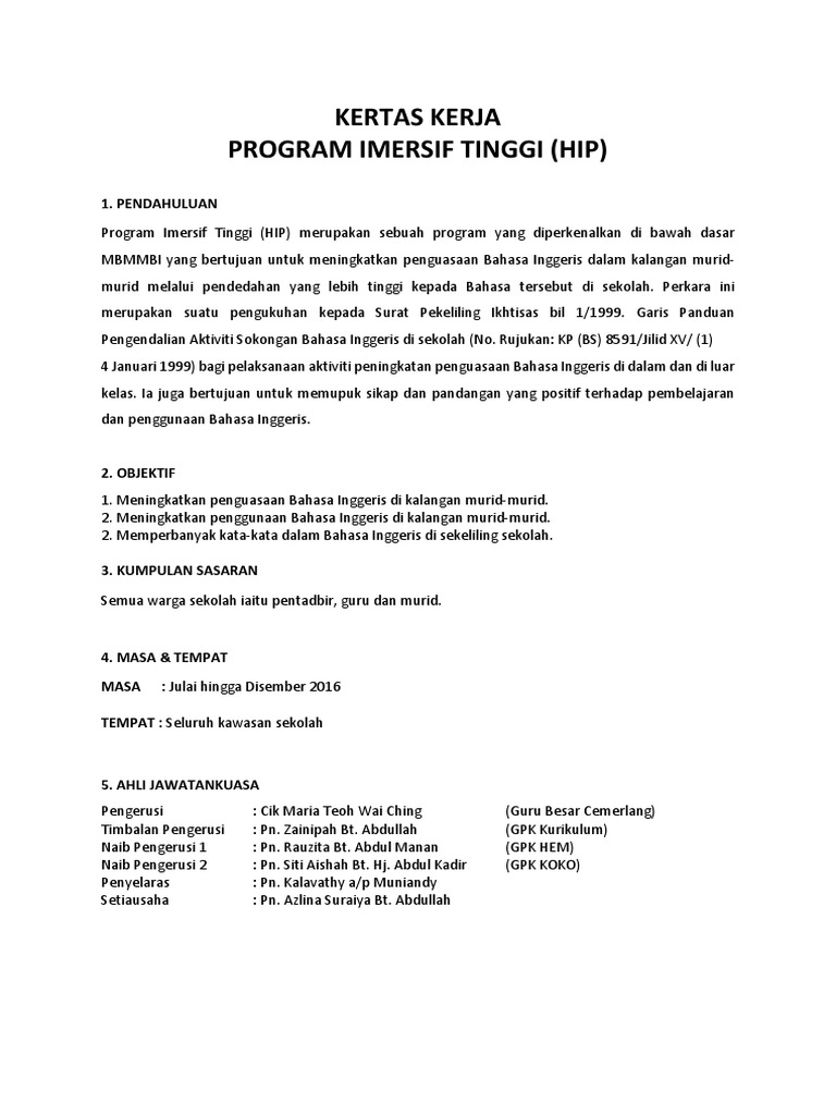Kertas Kerja Pelaksanaan HIP 3. Kertas kerja program hip ini adalah perkongsian yang membantu guru guru membuat perancangan atau menguruskan program hip. View flipping ebook version of KERTAS KERJA HIGHLY IMMERSIVE PROGRAMME 2019 SKTK published by mydhiliviknesh on 2019-02-21.