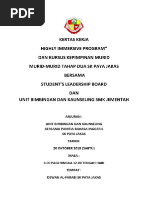 Oleh sebab itu kertas kerja bermaksud hasil penulisan yang mengandungi idea untuk dikemukakan kepada khalayak atau pihak-pihak tertentu. PELANCARAN HIGHLY IMMERSIVE PROGRAMME 10 LATAR BELAKANG PENGENALAN Program Imersif Tinggi HIP merupakan sebuah program yang diperkenalkan di bawah dasar MBMMBI yang bertujuan untuk meningkatkan penguasaan bahasa Inggeris dalam kalangan murid-murid melalui pendedahan yang lebih tinggi. Kulliyyah kumpulan kluster dengan kerjasama sekiranya ada.